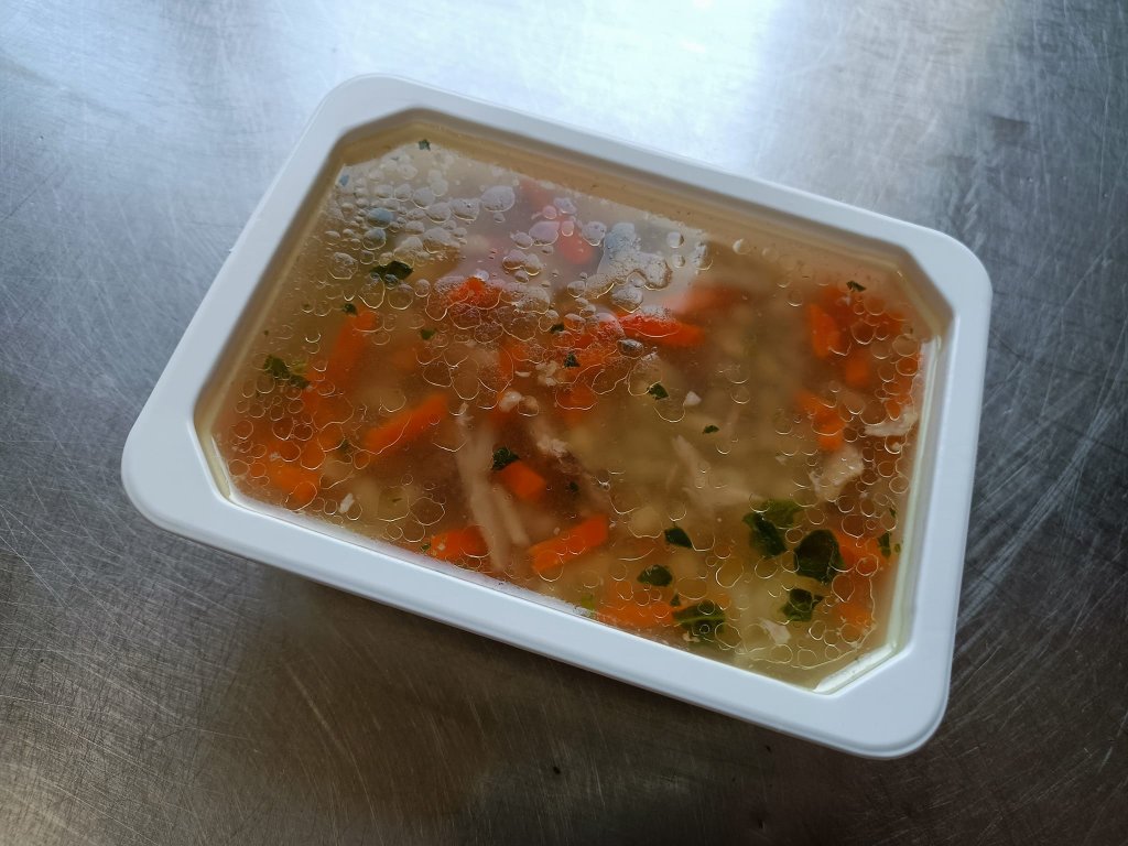 Složení: vývar z vepřového masa a kostí, kořenová zelenina, česnek, kroupy, koření