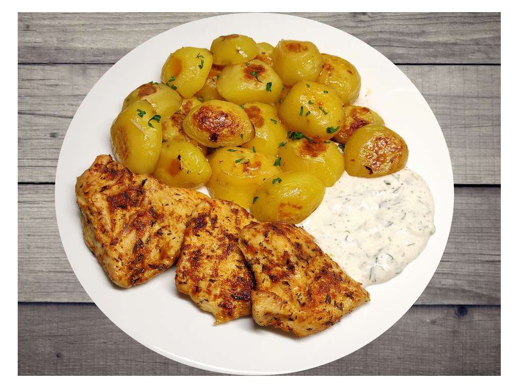 Kuřecí prsíčko s opečeným bramborem a česnekovým dipem čtvrtek